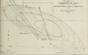 In the 1920s drillers began exploring the long band of hills along the Newport–Inglewood Fault zone, suspecting it was an anticlinal structure capable of holding oil. Huge fields along the zone were discovered at Huntington Beach Oil Field in 1920, and the Long Beach Oil Field in 1921.[1] Although no oil was initially found, 1921 also marked the first drilling for oil at Dominguez Hills on the northwest side of the Dominguez Rancho, site of the famous battle during the Mexican–American War called the Battle of Dominguez Rancho in 1846. The mineral rights to this property were owned by Carson Estate Company, the Hellman Family, the Dominguez Estate Company, and the Burnham Exploration Company of Frederick Russell Burnham.