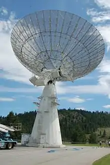The John A. Galt Telescope consists of a single 25.6-metre-diameter (84 ft) metal-mesh antenna which can be equipped to observe at 408 MHz and at 1.5, 2.7, 4.9, 6.6, and 8.4 GHz, including the hydrogen line near 1.4 GHz, the OH lines around 1.6 GHz, and the methanol line near 6.6 GHz.[4] The telescope, formerly simply referred to as the 26-metre Telescope, was renamed in honour of John A. Galt, first employee and former director of the DRAO, during a special ceremony in 2014.[5] The Galt telescope was used in the first successful measurements using very long baseline interferometry.