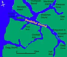 Doubtful Sound contains about a dozen smaller islands, with the more notable ones being Elizabeth Island, Fergusson Island,[12] Bauza Island, and the Shelter Islands.[13] Parts of the sound on the west side of Elizabeth Island are protected by the Taipari Roa (Elizabeth Island) Marine Reserve.