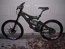 A downhill bike (also known as a downhill mountain bike) is a full suspension bicycle designed for downhill cycling on particularly steep, technical trails. Unlike a typical mountain bike, durability and stability are the most important design features, compared to lighter, more versatile cross-country bikes. Downhill bikes are primarily intended for high-speed descent, and downhill riders will usually push, or shuttle via chairlifts or motorized vehicles, to the trailhead.[1] Downhill bikes share similarities with freeride bikes due to their large strong frames and increased travel.[1]