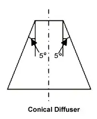 1. Conical diffuser or straight divergent tube – This type of draft tube consists of a conical diffuser with half angle generally less than equal to 10° to prevent flow separation. It is usually employed for low specific speed, vertical shaft francis turbine. Efficiency of this type of draft tube is 90%
