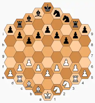 Dragonfly (also known as Shuttle Chess or Bird Chess) is a chess variant invented by Christian Freeling in 1983.[2][3][4] There are no queens, and a captured bishop, knight, or rook becomes the property of the capturer, who may play it as their own on a turn to any open square. The board is 7×7 squares, or alternatively a 61-cell hexagon with two additional pawns per side.