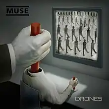 On 26 January 2015, Muse revealed the album title in an Instagram video featuring a mixing desk with audio samples and a screen stating "Artist – Muse, Album – Drones."[28] They also began using the hashtag "#MuseDrones" on Twitter and Instagram.[29] On 6 February, American artist Matt Mahurin announced he had created artwork for the album.[30][31] On 8 March, the band shared a snippet of the new song "Psycho" and mentioned "mixing with a very tight deadline".[32]