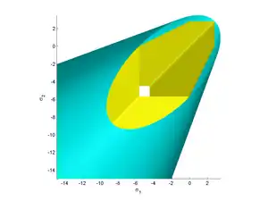 ![]() Figure 3: Trace of the Drucker–Prager and Mohr–Coulomb yield surfaces in the -plane for . Yellow = Mohr–Coulomb, Cyan = Drucker–Prager. | ||