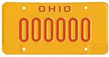 In 1967, Ohio began to issue special license plates to DUI offenders who are granted limited driving privileges such as work-related driving until a court can rule that they can have full privileges back. In 2004, the plates became mandated by state law to all DUI offenders.[40] Unlike Ohio's standard-issue plates (which as of 2008 have a picture of the Ohio countryside), the DUI plates are yellow with red writing with no registration stickers or graphics. They are commonly referred to as "party plates".[40]