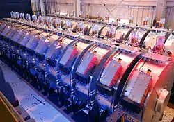 One of the problems was designing the new induction cores to fit in the confines of the previous facility. The design team had to replace the ferrite used in the first axis cores with "metglas"—paper-thin ribbons of amorphous iron tape. The maximum magnetic field strength (saturation point) in metglas is five times higher than in ferrite. The magnetic tape was insulated by thin layers of mylar and wound up into a roll of 20,000 turns to make mammoth six-foot-diameter cores, each four inches wide and weighing more than one and a half tons. Four cores fit into each induction cell.[1]