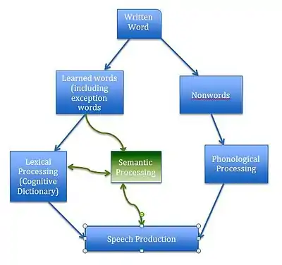 The lexical route is the process whereby skilled readers can recognize known words by sight alone, through a "dictionary" lookup procedure.[1][4] According to this model, every word a reader has learned is represented in a mental database of words and their pronunciations that resembles a dictionary, or internal lexicon.[3][4] When a skilled reader sees and visually recognizes a written word, he/she is then able to access the dictionary entry for the word and retrieve the information about its pronunciation.[2][5] The internal lexicon encompasses every learned word, even exception words like 'colonel' or 'pint' that don't follow letter-to-sound rules. This route doesn't enable reading of nonwords (e.g. 'zuce'), though some phonological output can still be produced by matching the word to an approximation in the lexicon (e.g. 'sare' activating visually similar known words like 'care' or 'sore').[1][5] There is still no conclusive evidence whether the lexical route functions as a direct pathway going from visual word recognition straight to speech production, or a less direct pathway going from visual word recognition to semantic processing and finally to speech production.[2]