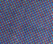 A very thin coating of collodion on one side of the film base was dyed blue, printed with closely spaced fine lines using a water-repelling greasy ink, and bleached. The clear spaces created were then dyed green. The ink was removed, and new ink lines were printed at a 90-degree angle to the blue and green lines. The new gaps were bleached and dyed red, resulting in a colour filter mosaic, known as a réseau, consisting of alternating green and blue squares between red lines, and having roughly one million colour filter elements per square inch.[3] In very early years, different arrangements of the same colours were used, the lines being green or blue instead of red and sometimes intersecting the other colours diagonally. After a final ink removal and the application of an isolating varnish, the same side of the film base was coated with a panchromatic black-and-white photographic emulsion. When exposed to light through the base and its réseau, the bit of emulsion behind each colour element recorded only the amount of light of that primary colour striking the film at that point.[4]