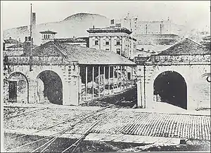 The tunnel in Dundee under the eastern flank of The Law seems to have been added as an afterthought, and difficult tunnelling conditions proved expensive; moreover land acquisition was considerably more expensive than had been allowed for. The Law Tunnel was completed on 21 January 1829, but later in the year the works generally were reported as at a standstill. Landale was dismissed from the service of the company, amid criticisms that he failed to control the contractors properly, and that the estimates had been considerably overspent.[4] The company had exhausted all its capital, and amid considerable acrimony, it decided to seek authorisation for additional capital and for borrowing powers, and these were granted by Act of 29 May 1830: £10,000 in additional shares and £20,000 in borrowing.[7][8] The Act also conferred powers to extend the line in Dundee to the waterfront, "through the streets",[3] and "the additional funds enabled completion of the line".[4]