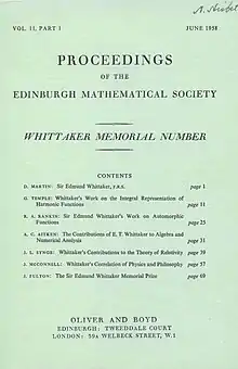 Front cover of the Whittaker Memorial Volume published in the Proceedings of the Edinburgh Mathematical Society in June 1958. The Proceedings is a delayed open-access journal, where the contents are free to read one year after publication.