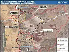Though critics say that the plan is intended to cut off Palestinian neighborhoods of East Jerusalem from the rest of the West Bank, Palestinian neighborhoods like Abu Dis in East Jerusalem would still have access to the West Bank.[38] Once the E1 plan is implemented, Palestinians will be able to travel from Bethlehem to Ramallah by going around Ma'ale Adumim. The Israeli government offered in 2008 under then Israeli premiere Ehud Olmert to build a road as part of a comprehensive settlement connecting Bethlehem and Ramallah, but the Palestinians rejected it.[39]