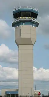 Control tower in 2009 decorated with banner proclaiming "World's Busiest Control Tower"
