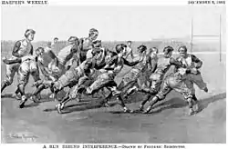 The 1885 season was notable for one of the most celebrated football plays of the 19th century – a 90-yard punt return by Henry "Tillie" Lamar of Princeton in the closing minutes of the game against Yale. Trailing 5–0, Princeton dropped two men back to receive a Yale punt. The punt glanced off one returner's shoulder and was caught by the other, Lamar, on the dead run.[36] Lamar streaked down the left sideline, until hemmed in by two Princeton players, then cut sharply to the middle of the field, ducking under their arms and breaking loose for the touchdown. After the controversy of a darkness-shortened Yale-Princeton championship game the year before that was ruled "no contest", a record crowd turned out for the 1885 game. For the first time, the game was played on one of the campuses instead of at a neutral site, and emerged as a major social event, attracting ladies to its audience as well as students and male spectators.[37] The Lamar punt return furnished the most spectacular ending to any football game played to that point, and did much to popularize the sport of college football to the general public.[38] One source lists Princeton captain C. M. DeCamp as the player of the year.[39]