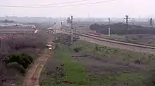 The north end of the Lod–Kfar Saba section in 2017: the dirt road aligns with the original single-track line to Hadera; the double-track line curving to the right is the beginning of the Sharon Railway