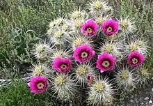 Engelmann's hedgehog cactus usually grows in clusters, sometimes up to 20 and more stems.[1] The bright magenta flowers bloom in April in its southern extremes to late May at northern locations. Flowers are borne at the upper half to one third of the stem and are funnelform in shape, up to 3.5 inches (8.9 centimetres) long with dark-green stigmas. The fruit is spiny. At first the fruit is green, becoming pink and drying when ripe. Ripe fruits have spines that are easily detached. Seeds are black and about a tenth of an inch in size.