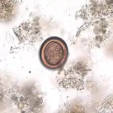 Echinococcus eggs contain an embryo that is called an oncosphere or hexcanth. The name of this embryo stems from the fact that these embryos have six hooklets. The eggs are passed through the feces of the definitive host and it is the ingestion of these eggs that lead to infection in the intermediate host.[24]