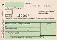 Another common activity that was troublesome if not disruptive was the practice of offering a sum of money beyond the selling price to individuals selling desirable goods, or giving something special as partial payment for products in short supply, the so-called Bückware (duck goods; sold from "below the counter"). Such ventures may have been no more than offering someone Trinkgeld (a tip), but they may have also involved Schmiergeld (bribes; lit. money used to "grease" a transaction) or Beziehungen (special relationships).[6]