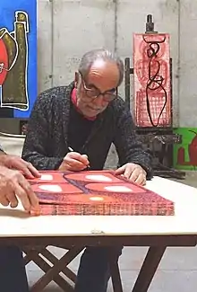 The Catalan artist has various murals and sculptures on view in the public space, some of the former that are still viewable include murals in Barcelona's Raval district,[8][9] Parets del Vallès, painted in collaboration with Rafael Bartolozzi Lozano (Pamplona 1943 – Tarragona 2009), and L'Hospitalet.[8] Two of his sculptures are in L'Hospitalet de Llobregat as well: L'Acollidora (≈ The Welcomer), on Rambla Just Oliveras,[10][11] and El pont de la llibertat (Liberty Bridge), at the rotunda on Rambla de la Marina at its confluence with Avinguda del Carrilet.[12][13][14][15]