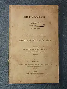 Education is an 1813 comedy play by the British writer Thomas Morton.[1] It premiered at the Theatre Royal, Covent Garden in London on 27 April 1813.[2] The original cast included Charles Mayne Young as Count Villars, Charles Mathews as Sir Guy Stanch, John Fawcett as Mr. Templeton, Charles Kemble as Vincent Templeton, John Liston as Suckling, William Barrymore as Damper, John Emery as Broadcast, Mary Catherine Bolton as Rosine, Maria Theresa Kemble as Mrs Templeton, Sarah Booth as Ellen and Mary Ann Davenport as Dame Broadcast.