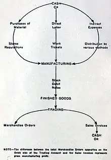 A special feature of the Principles of Factory Cost Keeping (1913) was an illustration and description of the progress of factory work as it appears in the books. It is illustrated in the accompanying diagram, which shows the operation of a factory cost system from the time payment of cash is made to begin production until the goods have been completed and are available for sale. At the bottom of the diagram Moxey noted, that the difference between the total Merchandise Orders appearing and the Debit side of the Trading Account and the Sales Invoices represents gross manufacturing profit.[17]