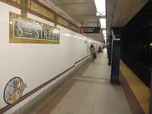 The station's platforms originally could only fit six 67-foot-long (20 m) cars. In 1926, the New York City Board of Transportation received bids for the lengthening of platforms at nine stations on the Broadway Line, including the Eighth Street station, to accommodate eight-car trains. Edwards & Flood submitted a low bid of $101,775 for the project.[9] The platform-lengthening project was completed in 1927, bringing the length of the platforms to 535 feet (163 m).[10][11]