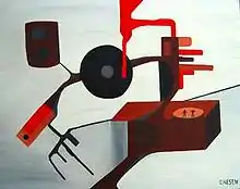 He sometimes attaches electronic or hardware objects, such as water faucets, to his oils as with "Duchamp Meets Home Depot", an homage to Marcel Duchamp’s sea changing work with plumbing art.