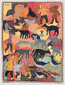 Elizabeth Angrnaqquaq (1916–2003) was an innovative Canadian Inuk textile artist active from the 1970s to early 2000s. Angnaqquaq's work explores textile creations while experimenting with non-traditional methods. Her style has been described as painterly for the way in which she fills the space between her figures and animals with embroidery.[1]