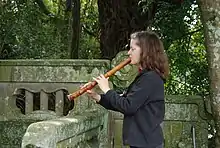 While on an orchestra tour of Japan during this period, Brown discovered the shakuhachi, an ancient Japanese bamboo flute whose varied, subtle tones she has likened to the private music in her head.[5] The instrument evokes nature and was traditionally played by mendicant Zen monks as a mode of meditation.[34][35] After studying in the Kinko School tradition with Ralph Samuelson, and Mizuno Komei and Yamato Shudo in Japan, the instrument became a major influence on her musical language.[20] In subsequent years, Brown learned the theremin—after seeing a documentary on the life of Leon Theremin in the mid-1990s—and the đàn bầu (Vietnamese monochord), traveling to Vietnam to study in 2000.[23][36] She has incorporated all three instruments into her composing.