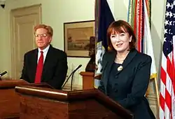Symons was created a Labour life peer as Baroness Symons of Vernham Dean, of Vernham Dean in the County of Hampshire, on 7 October 1996.[1] From May 1997 to June 1999, she took her first government post, serving as a junior Foreign Office Minister. From 1999 until 2001, she was Minister of State for Defence Procurement and, from 2001 until 2003, Minister of State for Trade. From 2001 until 2005, she was Minister of State for Foreign Affairs with responsibility for the Middle East, International Security, Consular and Personal Affairs, and Deputy Leader of the House of Lords.