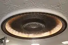 The auditorium's ceiling is mostly flat but is designed with plasterwork in low relief.[13] The center of the ceiling has a wide recessed dome, which is surrounded by eight smaller brass-and-crystal lighting panels.[24] The central dome is surrounded by gilded filigree decorations, which were subsequently painted cream to match the surrounding ceiling.[30] Rambusch Studio designed the lighting fixtures.[4][30] According to Exhibitor's Trade Review, the lighting fixtures were designed specifically for the theater, with a mixture of direct and indirect lighting.[16]