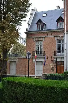 The chancery of the Philippine Embassy in Paris is in a 19th-century pleasure house (maison d'agrément) on Hameau de Boulainvilliers,[7] which also has an adjacent entrance on Rue de Ranelagh.[8] Originally part of the former Château de Boulainvilliers,[7] the chancery is beside the birthplace of tennis player Suzanne Lenglen.[9]