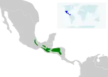 The nominate subspecies of emerald-chinned hummingbird is found discontinuously from Veracruz in southern Mexico through Guatemala into northern Honduras. A. a. aurea is found from southern Honduras into northern Nicaragua. The species inhabits the interior and edges of humid evergreen montane forest and pine-evergreen forest. In elevation it ranges between 1,000 and 2,200 m (3,300 and 7,200 ft).[5]