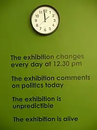 The strict time schedule of the exhibition is in place to stay as close to the present moment as possible.[1] The exhibition aims to coincide with life itself, time is unstoppable, the exhibition must keep up with it. If the exhibition can keep up with time itself, there is the possibility of art being able to provoke action.[16] Geoffroy sees the art world as lacking the ability as only able to comment on “yesterday’s world” and Emergency Room's time-based structure is an attempt to subvert this effect.[17] In this is the idea of the artist being “in time”.[18] There is a text on the outer walls of the Emergency Room structure that specifies the relationship to time and reinforces the time structure of the exhibition.[19] An analog clock hangs on this wall as well, to help artists keep to the schedule and as a reference point for museum visitors to know when the exhibition is changing or when the artists will arrive.[19] Geoffroy is often quoted using the phrase "Now before it is too late", in regards to the idea that issues need to be dealt directly with as soon as possible to have an effect before things can't be changed.[20][21]