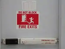 Some have alarms activated when they are opened, to alert staff of unauthorized use during non-emergencies.[8] On many exits, the user may have to push against a crash bar or other door opening device for a period of time to unlock the door. Many exits have a sign reading, "Emergency exit only, alarm will sound if opened", to warn of the fact that it is an emergency exit only.