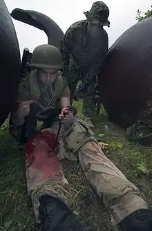 {{cite journal}}: CS1 maint: unfit URL (link) - ↑ Hill, JP; Montgomery, LD; Hopper, KW; Roy, LA (2007). "Evaluation of Self-Applied Tourniquets for Combat Applications, Second Phase". US Navy Experimental Diving Unit Technical Report. NEDU-TR-07-07. Archived from the original on 2009-09-21. Retrieved 2008-07-22.
