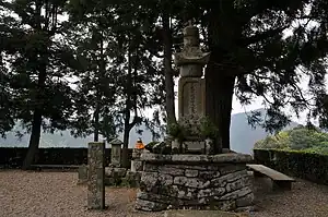 A mendicant visited the house of Emon Saburō, richest man in Shikoku, seeking alms. Emon refused, broke the pilgrim's begging bowl, and chased him away. After his eight sons fell ill and died, Emon realized that Kūkai was the affronted pilgrim and set out to seek his forgiveness. Having travelled round the island twenty times clockwise in vain, he undertook the route in reverse. Finally he collapsed exhausted and on his deathbed Kūkai appeared to grant absolution. Emon requested that he be reborn into a wealthy family in Matsuyama so that he might restore a neglected temple. Dying, he clasped a stone. Shortly afterwards a baby was born with his hand grasped tightly around a stone inscribed "Emon Saburō is reborn." When the baby grew up, he used his wealth to restore the Ishite-ji (石手寺) or "stone-hand temple", in which there is an inscription of 1567 recounting the tale.[1][2]