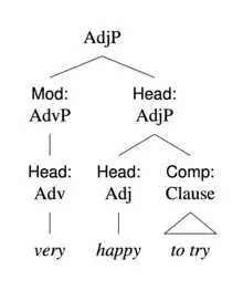 An adjective phrase (AdjP) is headed by an adjective and optionally takes dependents. AdjPs can take modifiers, which are usually pre-head adverb phrases (e.g., truly wonderful) or post-head preposition phrases (e.g., too big for you; afraid of the dark). The following tree diagram in the style of The Cambridge Grammar of the English Language shows the AdjP very happy to try, with the adverb very as a modifier and the clause to try as a complement.