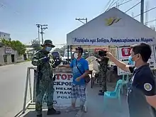 Philippine Red Cross volunteers scanning the temperature of commuters entering the provincial capitol in Bayombong, Nueva Vizcaya