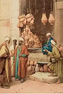 He specialised in watercolor and orientalist scenes. He was influenced by the style of the painter, Escordi.[3] Like many other members of the Italian school of Orientalist art, he made extensive use of photography in his work. For example, he used a photograph as the template for the background in his painting of a pottery shop.[4]