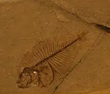 Eobothus is significant as one of the earliest genera of flatfish, one of the last major fish groups to evolve. It closely resembled modern flatfish, with an oval-shaped body about 10 centimetres (4 in) long, surrounded by elongated dorsal and anal fins.[1] In the adult, the eyes were both located on the left side of the head, as in modern species, and the fish would have lain flat against the seafloor on its right side. This was an evolutionary advance from still earlier flatfish, such as Heteronectes, in which the eyes only partially migrated.[2]