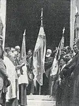 Following the Integrist secession Carlism abandoned its quasi-political format of the 1880s and assumed a decisively more active political stance; the nationwide structures started to emerge, initially styled as committees celebrating 1,400 years since the Conversion of Recaredo. In Catalonia the organization was headed by Llauder, yet Janer – together with Manuel de Torrents – was nominated its vice-president, effectively the second-in-command in the regional party infrastructure.[77] However, his contribution to Carlist buildup seems meager. Though Carlist candidates started to take part in electoral campaigns and under the new nationwide leadership of Marqués de Cerralbo the movement took shape of an organized modern political party, there is little information on Janer's public activity in the early 1890s. Despite consolidation and growth of Catalan Carlism under the regional leadership of Llauder, Janer neither stood as candidate in elections nor was recorded as active in supporting electoral campaigns. While de Cerralbo was striving to implement a new formula of mass mobilization[78] Janer seemed attached rather to old-style patterns and at best took part in closed-door party feasts, like the one in 1893.[79] His popular initiatives stuck to the pilgrimage format, e.g. when organizing workers' romería to Rome in 1894[80] or signing homage letter to the papal nuncio; the document protested the governmental secularization policy.[81]