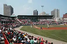 With the advent of the automobile age after World War II and government subsidies for highway construction, thousands of residents left Erie for suburbs such as Millcreek Township, which now has 55,000 residents.[17] This caused a decline in downtown retail businesses, some of which followed to the suburbs. Reflecting this perceived decline, Erie is occasionally referred to by residents as "The Mistake on the Lake" or "Dreary Erie".[18] Downtown Erie has undergone a resurgence in the early 2020s with the opening of Flagship City Food Hall and Flagship City Public Market.[19] [20]