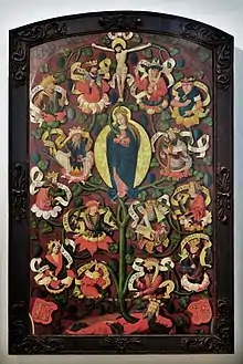 The text of "Es ist ein Ros entsprungen" dates from the 15th century. Its author is unknown. Its earliest source is in a manuscript from the Carthusian Monastery of St Alban, in Trier, Germany, that is now preserved in the Trier City Library and is thought to have been in use at the time of Martin Luther. The hymn first appeared in print in the late 16th century in the Speyer Hymnbook (1599).[6] The hymn has been used by both Catholics and Protestants, with the focus of the song being Mary or Jesus, respectively.[7] In addition, there have been numerous versions of the hymn, with varying texts and lengths. In 1844, the German hymnologist Friedrich Layriz added three more stanzas,[8][9] the first of which, "Das Blümelein so kleine", remained popular and has been included in Catholic[10] and Protestant hymnals.[11]