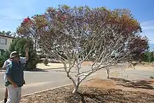 Red-flowered mallee is found in the southern Wheatbelt region of Western Australia where it grows in shrubland and open woodland in sandy-clay soils with lateritic gravel.[2] It is found from near Wongan Hills to near Corrigin and as far east as Southern Cross.[2][4]