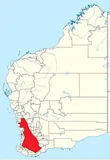 Wandoo occurs in the south west of Western Australia from Morawa in the north extending south through the Darling Range down to around the Stirling Range to the south coast near the Pallinup River. There is an outlying population found to the east of Narembeen at Twine Reserve.[14] It grows in sandy loams, clay loams or dark brown loamy soils and stony soils,[26]: 45 that can contain laterite, granite or gravel as part of an undulating landscape.[9] It is found along the base of the Darling Scarp[8] and spreads south and east out into the Wheatbelt[8] and as far as the Great Southern. It is native to the following IBRA bioregions; Geraldton Sandplains and Avon Wheatbelt in the north through the Swan Coastal Plain and Jarrah Forest to the Esperance Plains and Mallee in the south.[9] Wandoo is absent from the high rainfall areas between these regions. Subspecies pulverea is less common and occurs between Cataby and Morawa. It is usually found at elevations of 100 to 300 m (330 to 980 ft) in valleys or on plateaux and ridges where there is a Mediterranean climate and most rainfall occurs in the winter months and there is an average rainfall of 500 to 1,000 mm (20 to 39 in) per annum although it can be dry for six to seven months of the year. The average temperature range is usually 2 to 35 °C (36 to 95 °F).[10] It is often part of jarrah forest in medium rainfall areas but is not usually found in high rainfall areas.[8] The tree forms an open woodland where it often forms the overstorey mixed in with jarrah and marri trees.[28] Agricultural clearing has significantly altered the distribution of the tree and it now has a fragmented distribution and is mostly situated in conservation reserves, state forests, on roadside verges and as paddock trees.[8]