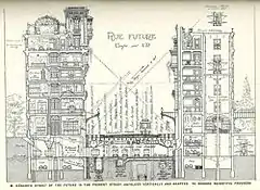 Hénard was the first to propose the concept of an artificial ground level, which influenced later urban architects such as Auguste Perret and Le Corbusier.[37] He envisioned a "service road" running below the road used by the residents of his magnificent buildings, with their elevators, roof gardens and rooftop helicopter landing pads.[lower-alpha 1][36][39] Concepts presented in Le Corbusier's 1915 work on "Pilotis-Cities", where buildings would stand on stilts to increase the space available for traffic flow, derive from Hénard's 1910 work.[40] However, Hénard presented his innovations within the framework of the contemporary Parisian fin-de-siècle decorative style, while Le Corbusier thought a new urban form would better meet the needs of the new age.[41]