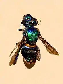 Euglossa cordata is a primitively eusocial orchid bee of the American tropics.[2] The species is known for its green body color and ability to fly distances of over 50 km. Males mostly disperse and leave their home nests, while females have been observed to possess philopatric behavior.[3] Because of this, sightings are rare and little is known about the species.[4] However, it has been observed that adults who pollinate certain species of orchids will become intoxicated during the pollination.[5]