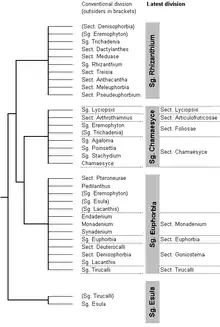 The genus Euphorbia is one of the largest and most complex genera of flowering plants, and several botanists have made unsuccessful attempts to subdivide the genus into numerous smaller genera. According to the recent phylogenetic studies,[23][24][25] Euphorbia can be divided into four subgenera, each containing several sections and groups. Of these, subgenus Esula is the most basal. The subgenera Chamaesyce and Euphorbia are probably sister taxa, but very closely related to subgenus Rhizanthium. Extensive xeromorph adaptations in all probability evolved several times;[33] it is not known if the common ancestor of the cactus-like Rhizanthium and Euphorbia lineages had been xeromorphic—in which case a more normal morphology would have re-evolved namely in Chamaesyce—or whether extensive xeromorphism is entirely polyphyletic even to the level of the subgenera.