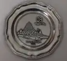 Expo '74's official logo debuted in March 1972 and was designed by Spokane artist Lloyd L. Carlson.[1] The logo is a stylized Möbius strip, an endless three-dimensional form, which was chosen to symbolize the continuity of life and mankind's relationship with the environment.[1] The three colors, blue, green, and white, also symbolized the environmental theme of the fair, representing the purity of clean water, the unspoiled natural beauty of growing plants and trees, and the cleanliness of fresh air, respectively.[1]