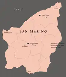 - Highest point : Monte Titano, 749 m at 43°56′06″N 12°27′00″E / 43.93500°N 12.45000°E